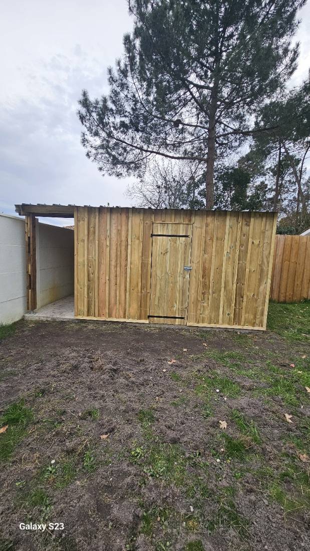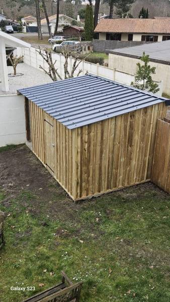 Cet abri de jardin en bois, installé à Gujan-Mestras, est conçu pour offrir un espace de stockage pratique et résistant. Sa structure repose sur une ossature en bois avec un bardage vertical, apportant un style naturel et chaleureux qui s'intègre parfaitement dans l'environnement extérieur.