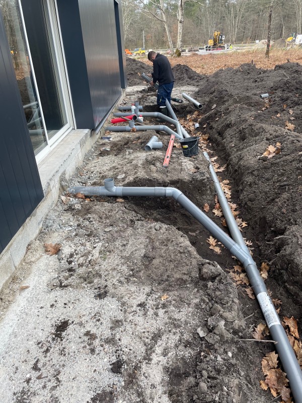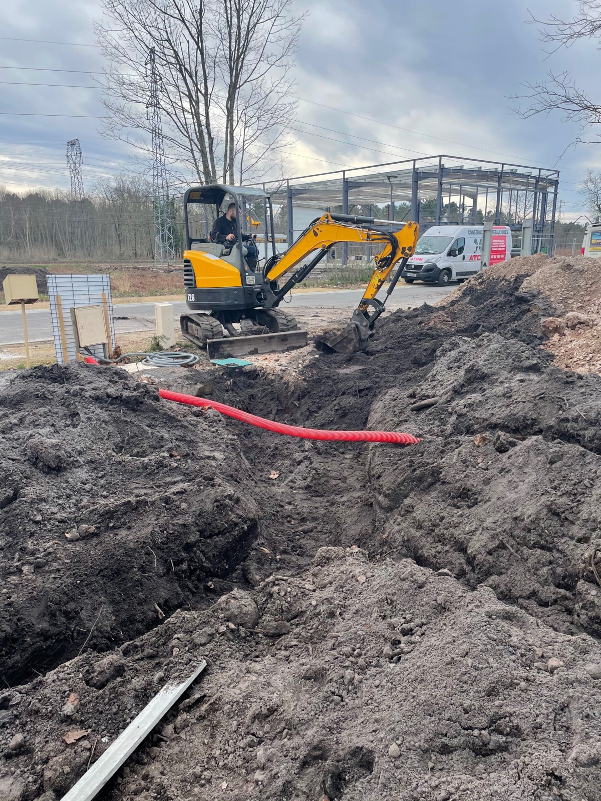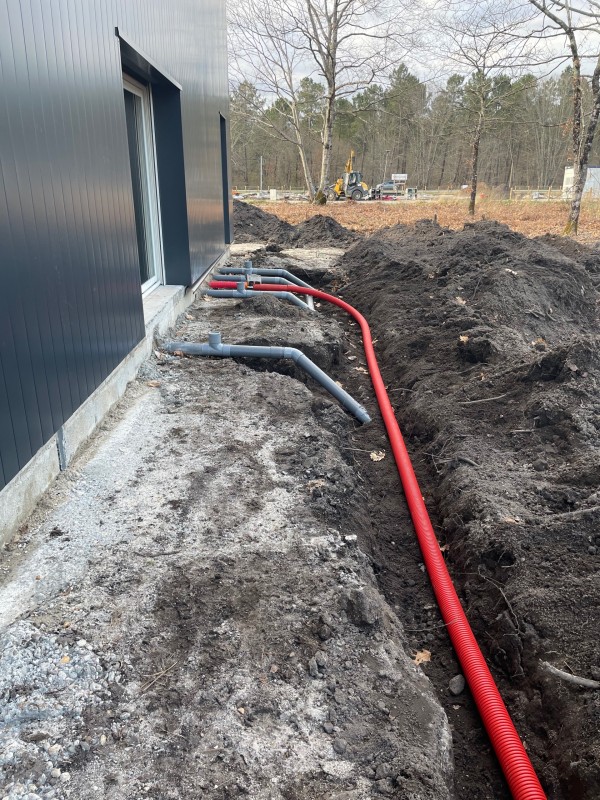 Nous avons tout d’abord réalisé l’étranger à l’aide d’une mini pelle puis fait le branchement au tout-à-l’égout jusqu’au local en tube PVC de diamètre 100 puis nous avons mis le tuyau do d’arrivée générale en diamètre 25 dans une gaine pour pouvoir le changer à tout moment et réaliser les puisards