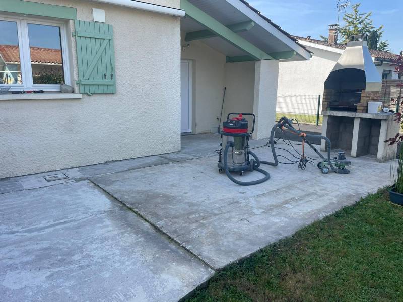 Pour la première étape de ce projet, un ponçage méticuleux du sol existant a été crucial. C'était une étape fondamentale pour assurer une base parfaitement lisse et uniforme avant d'entamer les travaux de