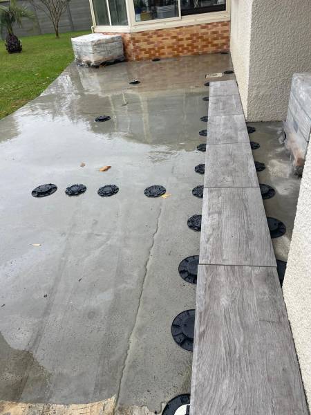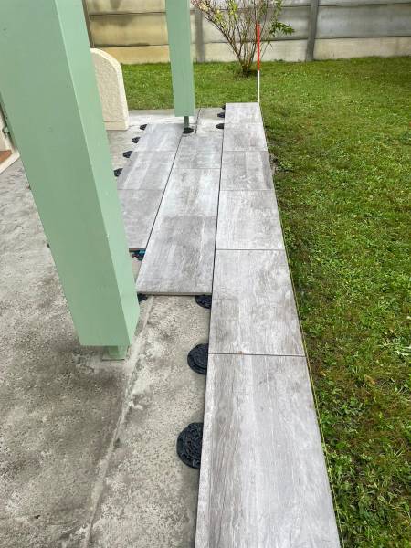 Cette méthode de pose sur plot a donné à la terrasse un résultat visuel impressionnant, offrant une finition impeccable et uniforme avec un motif régulier et esthétiquement attrayant sur l'ensemble de la surface carrelée.