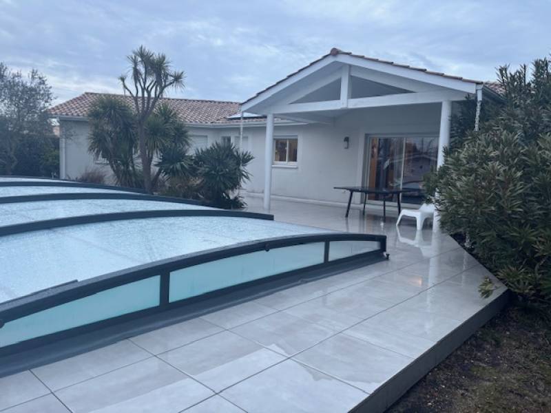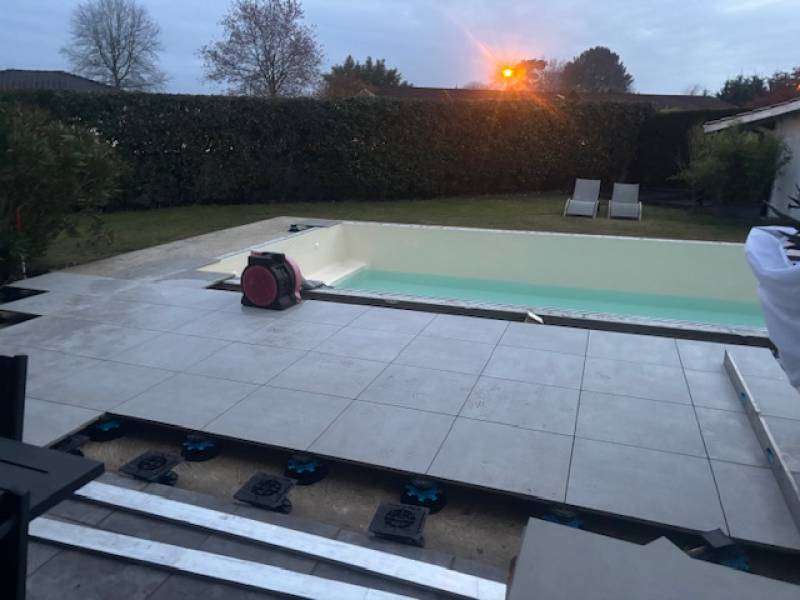 Ce chantier réalisé sur le Bassin d’Arcachon met en valeur une terrasse en carrelage extérieur blanc grand format, idéale pour apporter luminosité et élégance à un espace extérieur. Le carrelage blanc est particulièrement recherché pour son rendu contemporain et sa capacité à agrandir visuellement les surfaces.