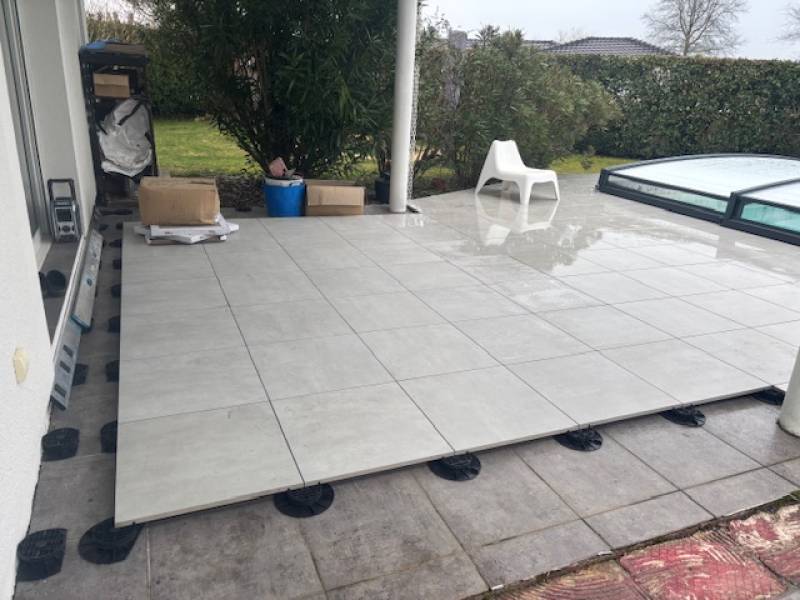 Selon la configuration du support, la pose de carrelage extérieur blanc peut être réalisée sur plots ou en pose collée. Chaque détail est étudié pour garantir un alignement parfait, un drainage efficace et des finitions propres sur les retombées.