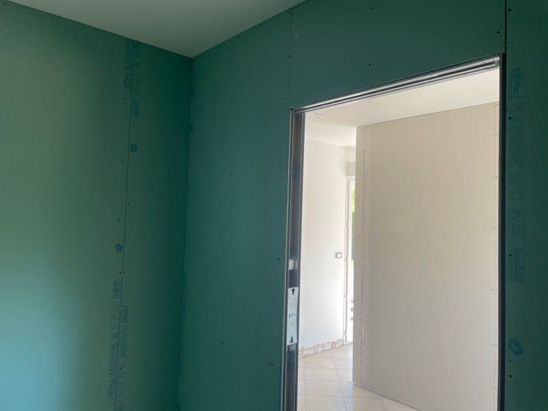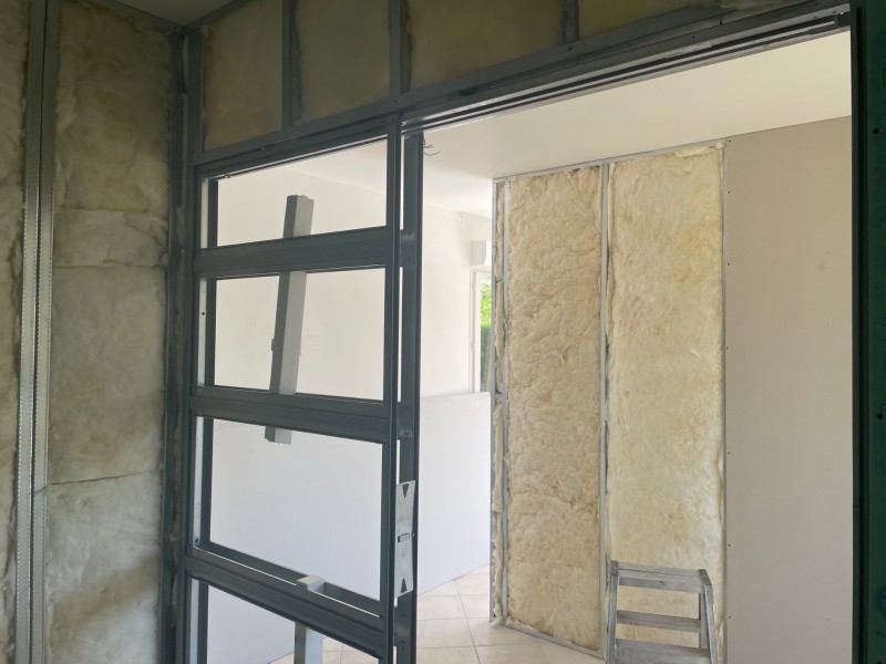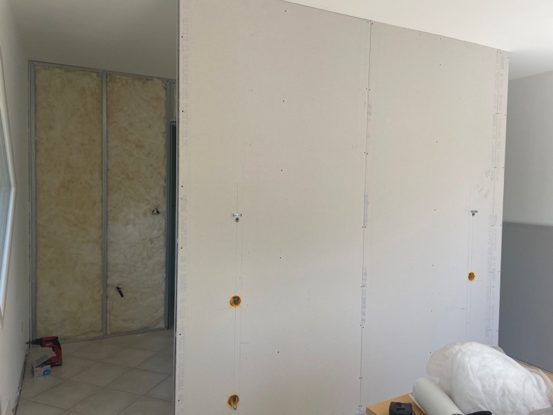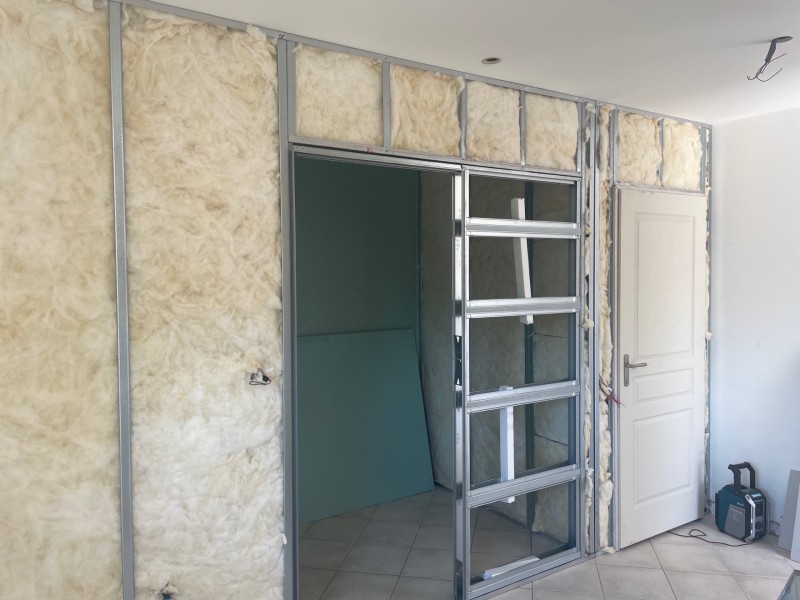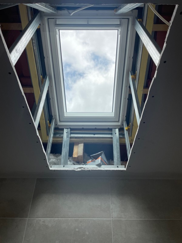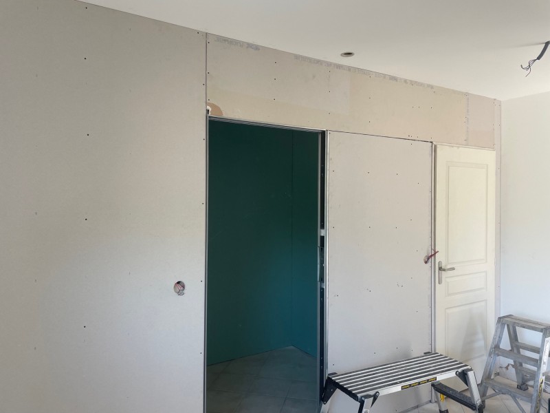 Tout d’abord nous avons réalisé les cloison séparatives pour la chambre au dressing ainsi que la salle de bain est fait la pose des portes intérieur en galandage. Puis nous avons réalisé la pose du bac à douche ainsi que la pose du carrelage sol et de la faïence puis nous avons réalisé l’ouverture au plafond après que le client il fait faire la pose du Velux pour pouvoir faire l’habillage tout autour.