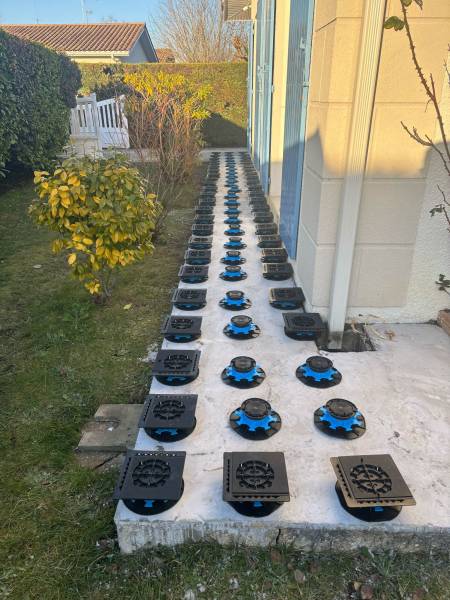 Ensuite, nous avons procédé à l'installation des plots réglables. Leur disposition stratégique permet de compenser les irrégularités du sol sans nécessiter de lourds travaux de terrassement, tout en assurant une répartition homogène du poids.