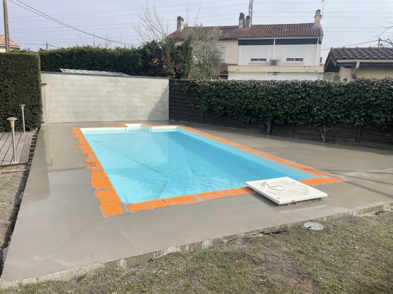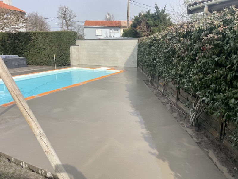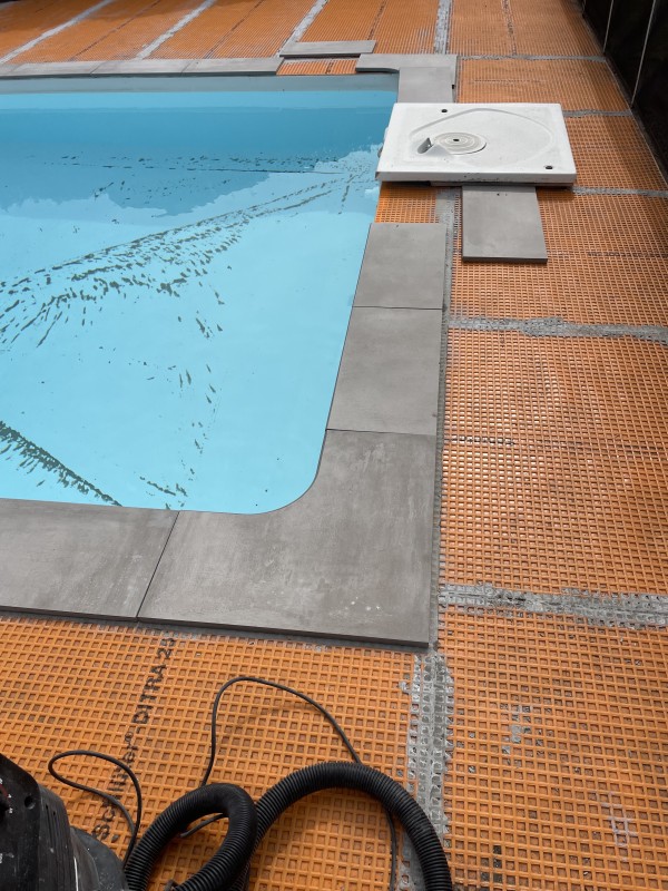 Tout d’abord nous avons réalisé le ponçage de la dalle puis appliquer une résine d’accrochage. L’étape suivante a été d’appliquer un ragréage pour rattraper les imperfections du béton et lisser le sol. Puis, après quelques jours de séchage, nous avons réalisé la pose de la natte de désolidarisation. Nous avons posé les margelles tout autour de la piscine avec la réalisation découpe, puis poser le carrelage, surtout le reste de la terrasse en double encollage et réaliser les joints.