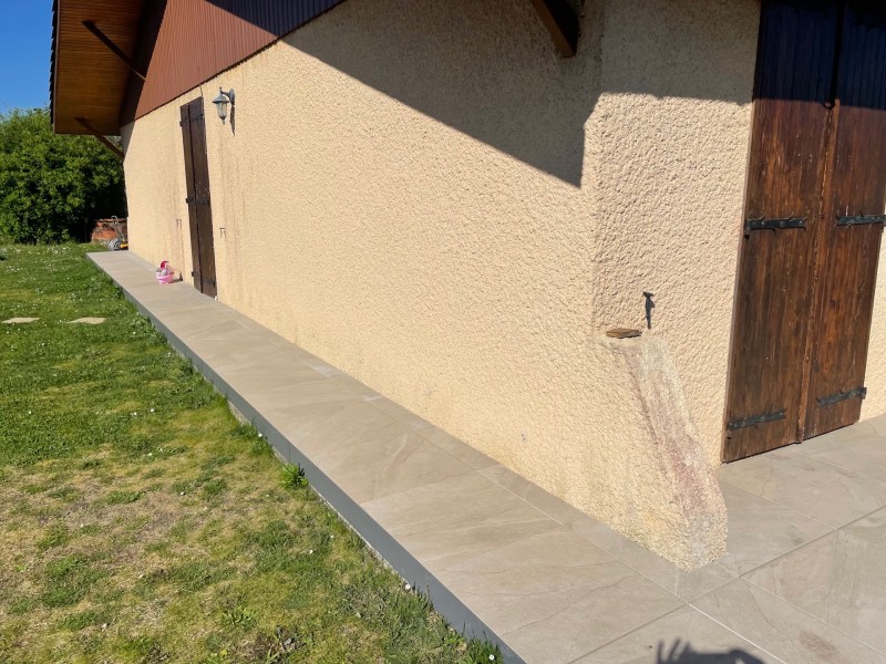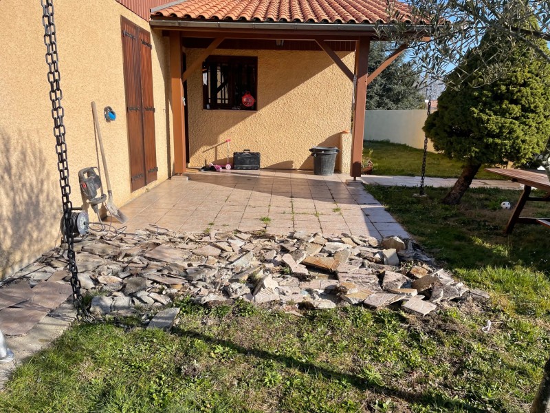 Nous avons tout d’abord cassé le carrelage avec la chape puis réaliser un ragréage pour aplanir la dalle béton est réalisé un rajout de dalle béton pour agrandir la terrasse. Puis nous avons fait la pose de carrelage sur plots de Jouplast avec des profiler alu de finition latérale et réaliser toutes les coupes à la machine à eau