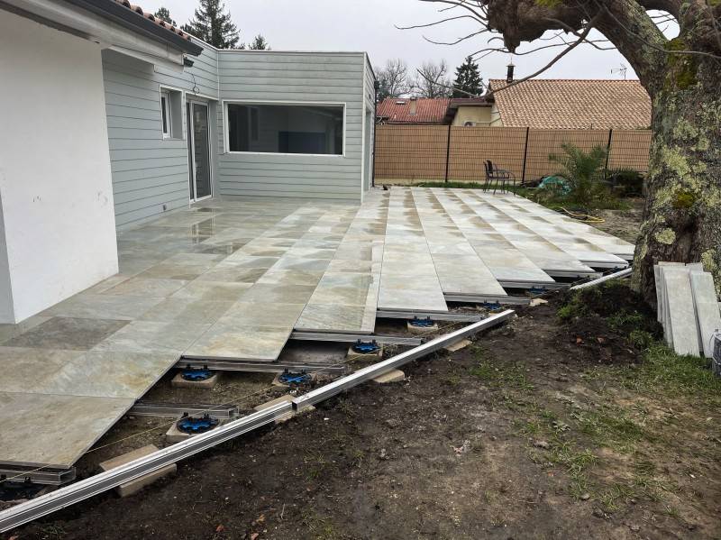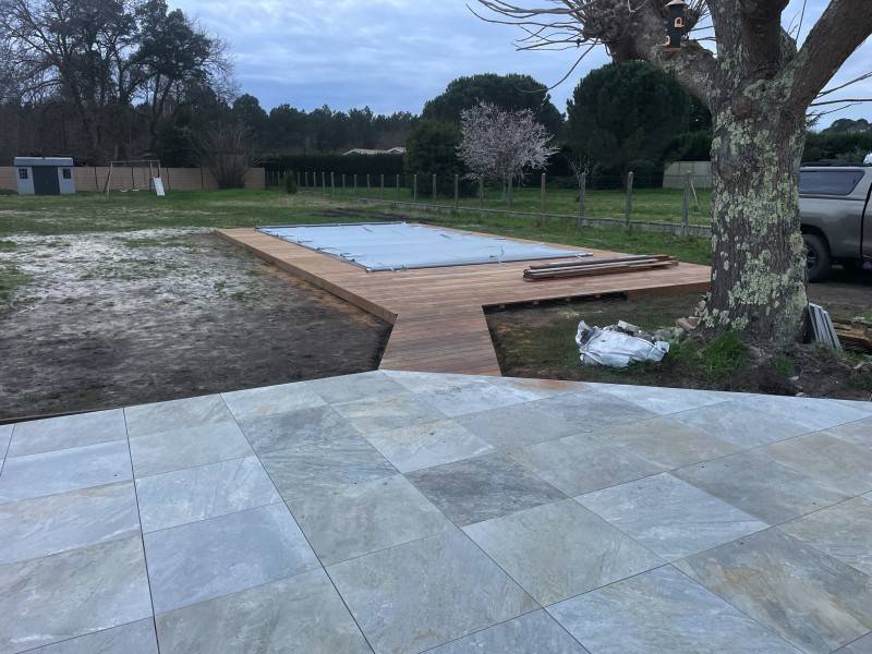 L’entreprise Jimenez Carrelage et Bois est intervenue à Pessac, en Gironde, pour transformer les abords d’une maison moderne avec une terrasse sur plots en carrelage et une plage de piscine en bois exotique. Un chantier aux finitions impeccables, pensé pour allier confort, esthétique et durabilité.