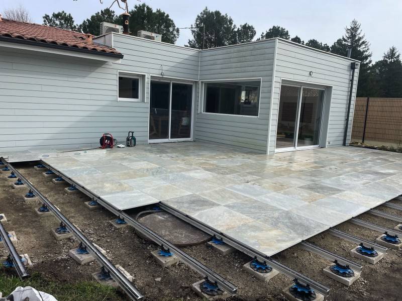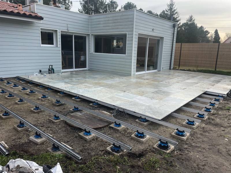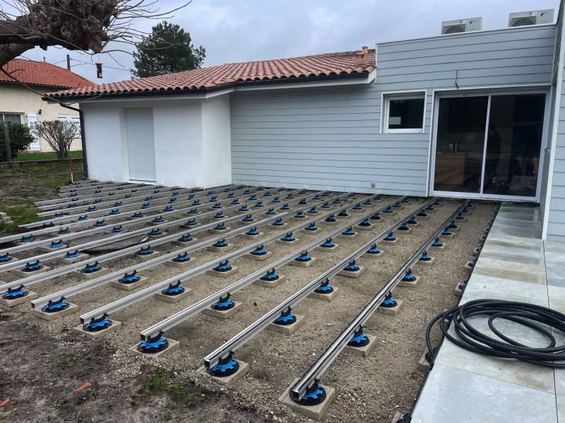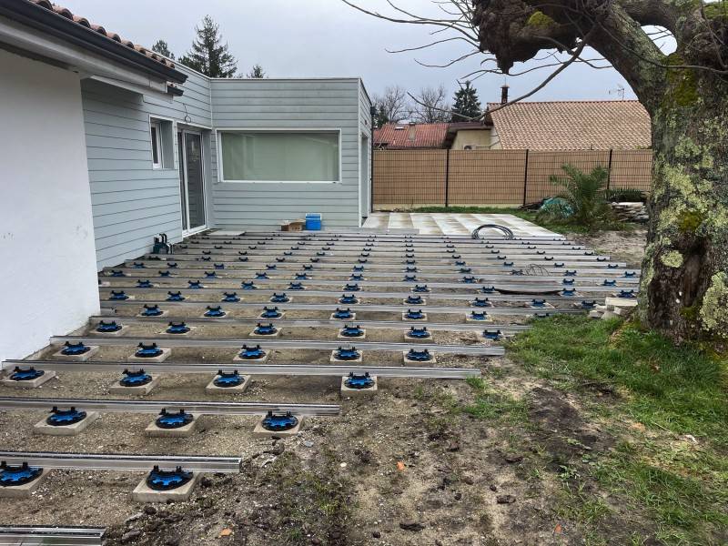 Comme le montrent les premières étapes du chantier, la terrasse repose sur une structure en aluminium posée sur plots réglables. Ce système permet d’assurer une parfaite mise à niveau tout en favorisant le drainage du sol. Sous les rails, un lit de calcaire compacté a été mis en œuvre pour garantir stabilité et durabilité.
