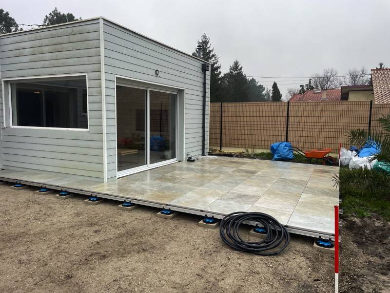 Des dalles en grès cérame grand format, effet pierre naturelle, ont été soigneusement posées. Ce choix de matériau apporte un rendu haut de gamme, tout en offrant une excellente résistance aux intempéries. Les coupes ont été réalisées avec précision, notamment autour des angles de la maison et des seuils de porte-fenêtre.